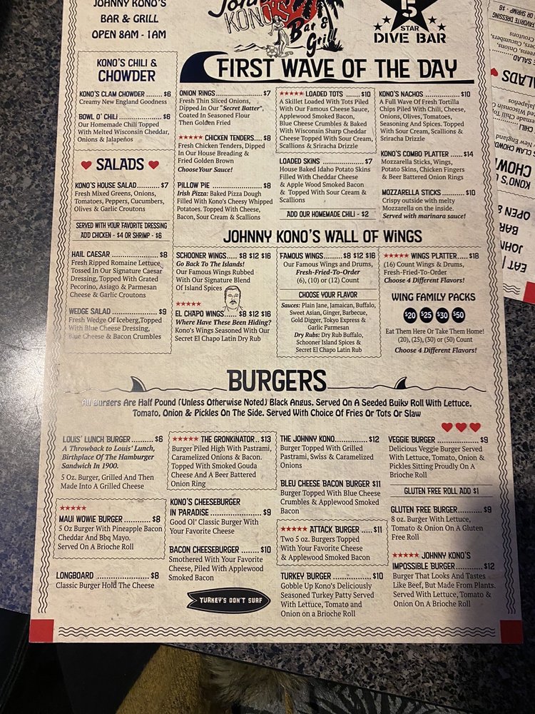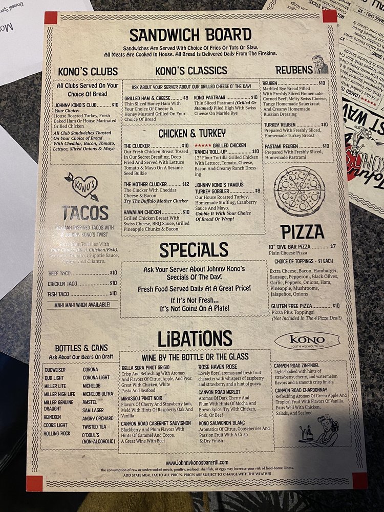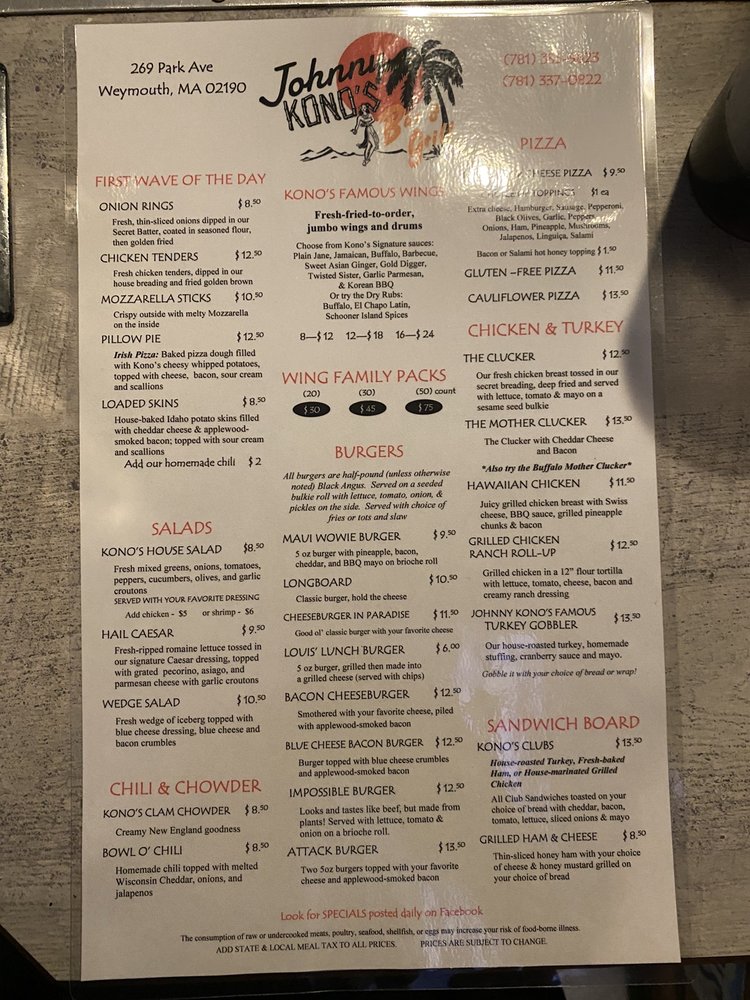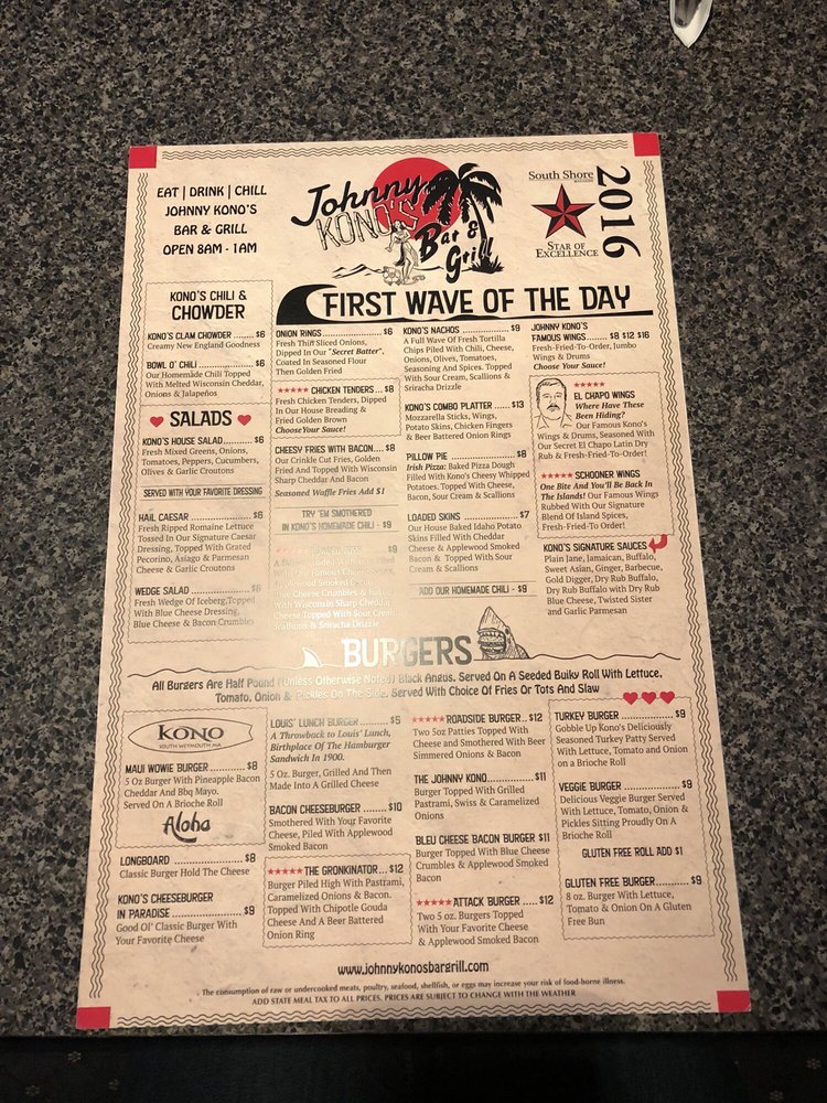 Johnny Kono's Bar & Grill, located in Weymouth, MA, is a buzzing American bar that offers a unique experience. With a diverse menu featuring pub-style favorites like burgers, pizzas, and seafood, this establishment has left a lasting impression on patrons. The Turkey Gobbler sandwich and onion rings come highly recommended, showcasing the quality of ingredients used. The El Chapo wings and Louis lunch burger have received high praise for their bold flavors and satisfying portions. The welcoming atmosphere, attentive servers like Meg, and vibrant bar scene make Johnny Kono's a must-visit spot for food enthusiasts. Whether you're craving a hearty meal or looking for a lively dining experience, Johnny Kono's Bar & Grill promises a memorable time.